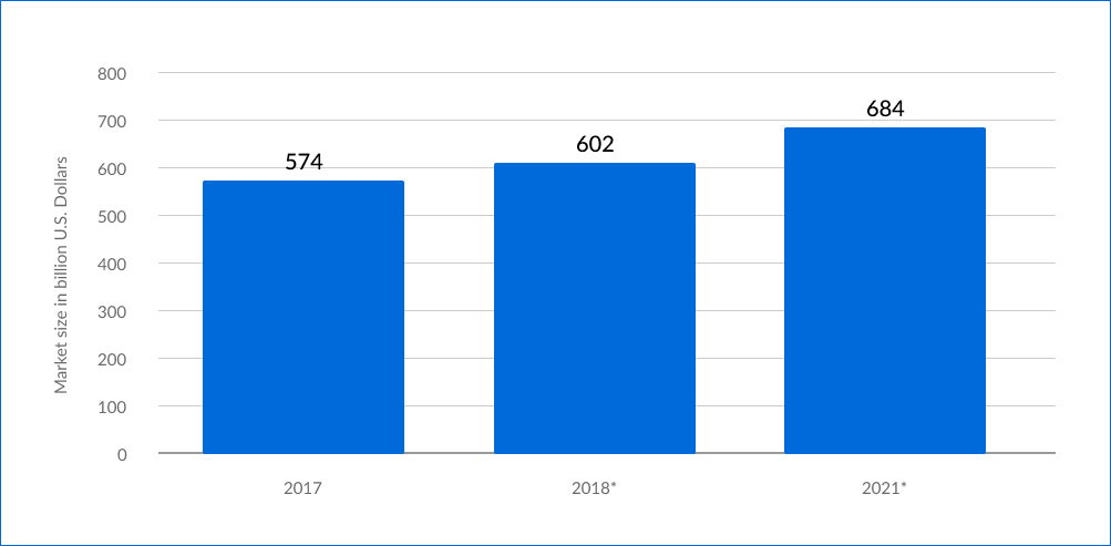 The below stats shows the estimated IT expenditure of small-to-medium-sized enterprises (SMEs) worldwide in 2017, 2018 and 2021. In 2021, SMEs are expected to spend 684 billion US dollars on IT hardware, software, and services, including business services, worldwide.