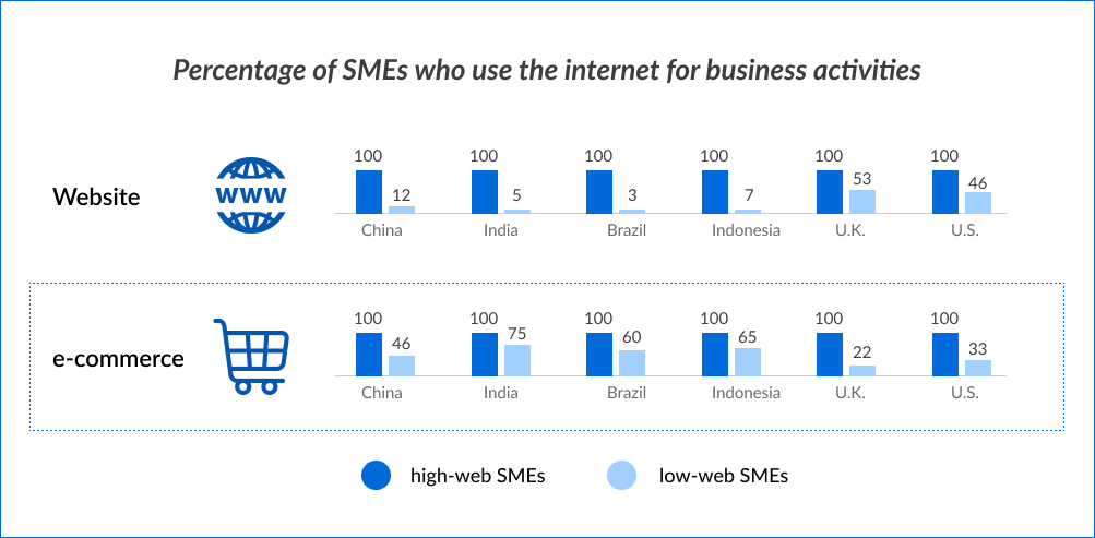 An important observation is that 100% of India’s high-web SMEs have e-commerce presence and 75% of the low-web SMEs have adopted online presence. A similar trend can be observed when drawing comparisons with other developing countries that can be seen in the below figure. This implies that even SMEs with a limited online presence and trifling in the developing markets are beginning to realize the potential of having an online presence.