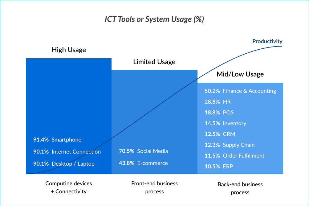 The figure below shows the usage of ICT among SMEs that mainly comes from personal devices, such as smartphones (91.4%), basic internet connection (90.1%) and computer or laptop (86.5%). The usage of back-end business processes, such as ERP and CRM are very low among SMEs.